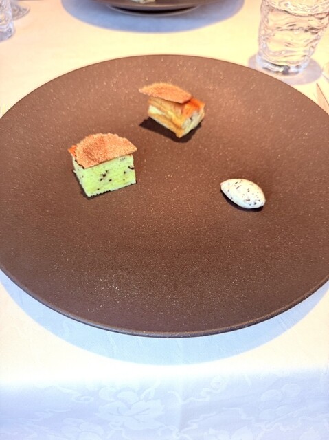 どれも美味しくて印象に残るお料理でしたが、西京味噌でつけたフォアグラのテリーヌが入った最中は、和と仏が融合したお味でとっても美味しかったです。