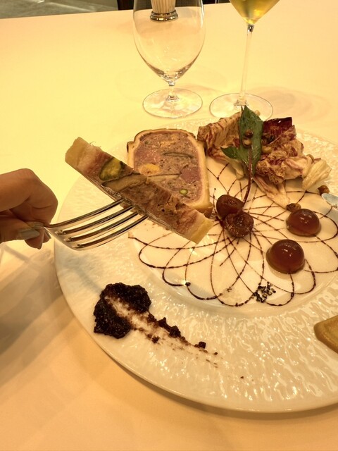 豚やフォアグラ、鳥レバーに牛タン、茸、ピスタチオ、ナッツ、周りは網脂...今いただいてるものはもちろん焼いてから5日間熟成されたもの。