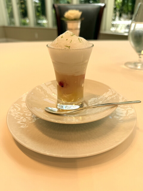 1番下にグレープフルーツのコンポート、ライチのゼリー、ライチのムースと重なる。1番上はミントを使った泡にライムの皮を削って香り付けされていて爽やかでお腹いっぱいでもスッキリと食べられてしまう。