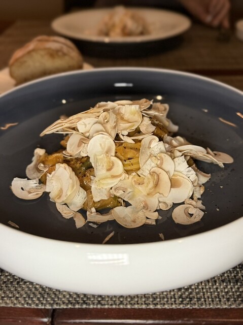 上にはフレッシュマッシュルームがどっさり。マッシュルームの香りとトマトの酸、間に忍ばせた秘密のスパイス(山椒かな…?)がアクセントになっていてめちゃくちゃ美味しいパスタで感動しました。