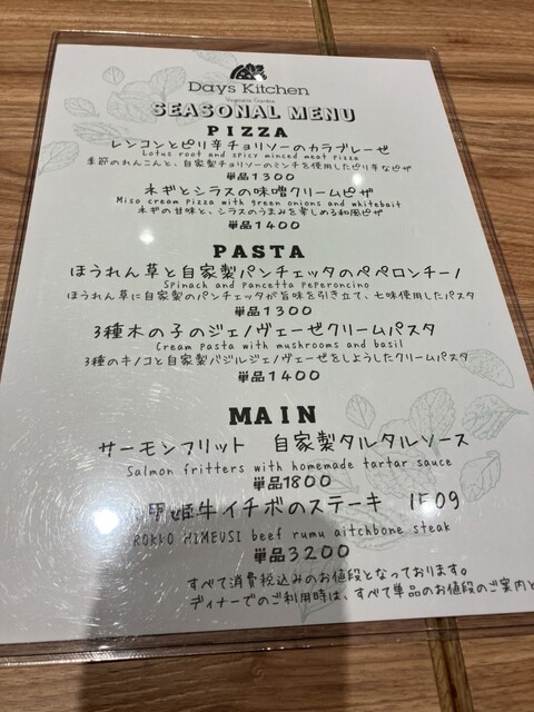 今日は初めてディナーに子供と訪問。ランチはサラダビュッフェが人気のお店ですが、夜はまた違って落ち着いた雰囲気です。ピザも窯で焼いていて今回注目したメニューもネギ、シラス、味噌のトッピングで他には無いメニューで美味しかったです。パスタもモチモチ食感で美味しかったです。夜なのでお酒と一緒に食事を楽しんでるお客さんもいてました。また行きたいです。