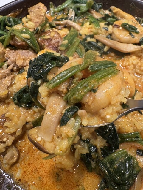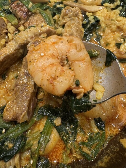 雑穀フライドガーリックシュリンプカレー、ほうれん草&キノコ、豚肩ロースステーキハーフ