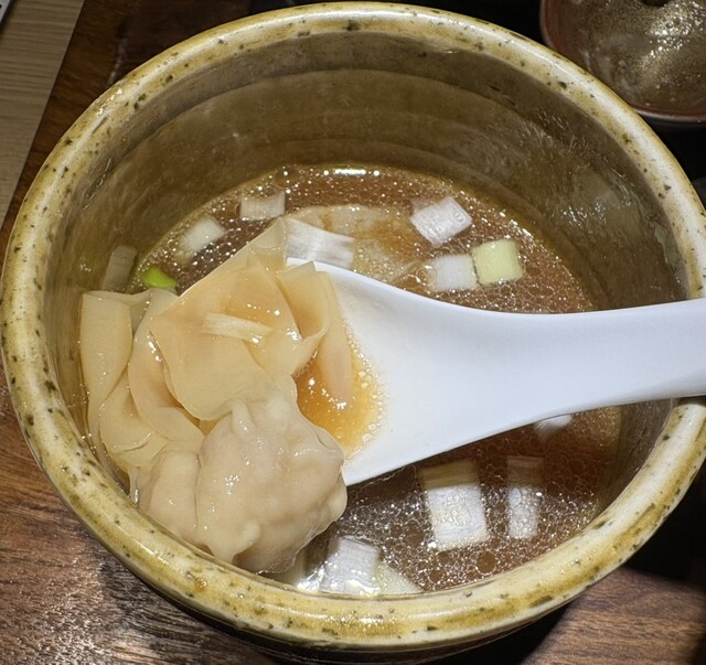 つけだれには、葱、小さめの帆立、ワンタン、肉団子