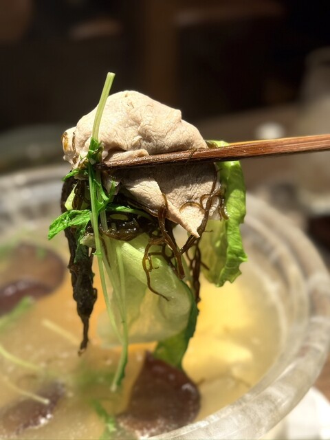 そしてしゃぶしゃぶは豚肉が柔らかく甘味があって上品な旨味を感じれる肉質でシッカリ目の塩気のあるお出汁に潜らせて自家製のシークワサーポン酢で頂く‼️
