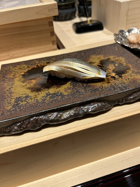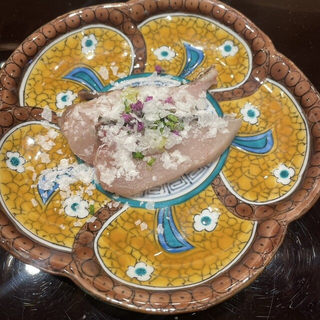さわらを1週間熟成しているそう。口に入れた瞬間藁の香りが鼻からぬけて、さわらが溶けていく感じがしました。優しい塩の味とわさびの味が後から溶け出しました。