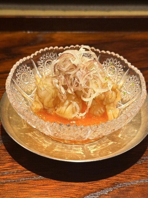 岩手の雲丹牧場で育てられた極上の雲丹は臭みが全くなく濃厚な旨味が口に広がってそこに昆布締めされたアオリイカを細かく刻んでイカのネットリ感と甘さが際立たったこの二つの組み合わせが口の中で冷たいお出汁の餡と絡まってサッパリとした後口。