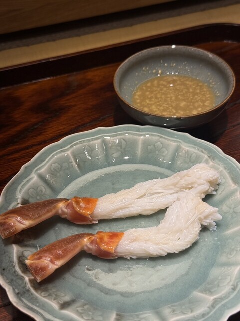昆布出汁にサッと潜らせた蟹は蟹味噌が入ったポン酢を付けて濃厚な旨味が味わえる。