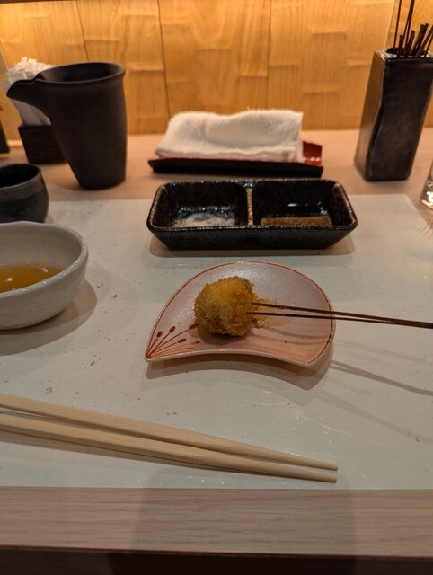 日本酒1合の酒器から小さなぐい呑みに注いで、くいっと流し込むと、実に良いタイミングで串かつを提供して...