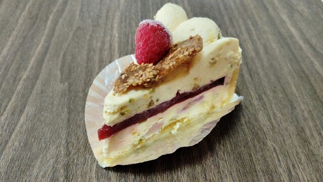 ライムの切れ味のあるライム果実そのままのような奥深い豊潤な香りのムースがふわっと食感、フランボワーズの華やかな酸味と風味が立体的な酸味と香りにスッキリした爽やかな酸味のケーキ