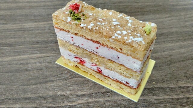 香り高いピスタチオに包まれる生地にサクサク食感とナッツの香ばしさ、いちごの活きの良い風味酸味が爽やか、白ワインのムースのスッキリした旨味がいちごとピスタチオを盛り立てる