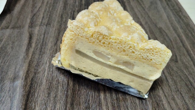 シンプルなマロンケーキ、ふんわり柔らか生地にマロンババロアの濃厚な香り風味をバタームースの濃厚なコクが増幅、洋酒の華麗な香りがマロンとバターを更に引き上げて増幅、マロンとバター洋酒の濃厚な風味を味わえるケーキ