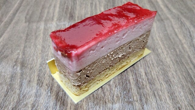 桃のムースとフランボワーズのムースの構成、桃のムースのアンニュイな雰囲気の味わい、甘みも抑えてぼんやりした印象に、フランボワーズもほんのり程度で桃のムースが前面にでて焦点主体が定まっていない少しぼけた弱さを感じるムース高いレベルでですが