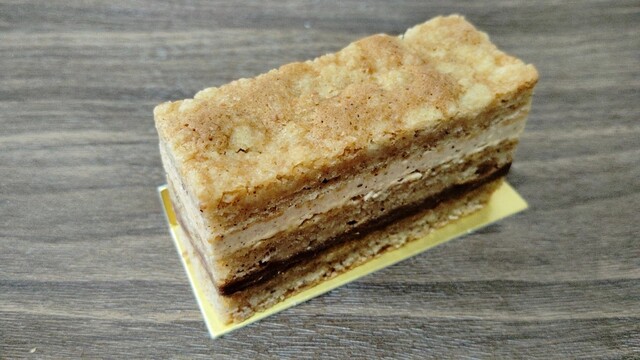 コーヒーの苦味、酸味、ウイスキーの香りが最高に美味しいケーキ、コーヒーとウイスキーのムースの抜群の相性、コーヒーの苦味と酸味に絡み合うウイスキーの熟成の香りが至高の組み合わせ、これだけで食べる価値ある焙煎豆と熟成麦オーク樽の運命的で必然であったかのような完璧なコンビネーション、チョコレートの奥深い風味が更にウイスキーとコーヒーを引き上げる、ビスキュイとダックワーズの違いのある香りと食感がウイスキーとコーヒーの香りをクッキリと明確に輪郭を浮かびあがらせ、ヘーゼルナッツ香ばさがアクセントに、コーヒーのジュレに酸味も◎、コーヒーとウイスキーの究極の出会いと溶け合いを感じる作品
