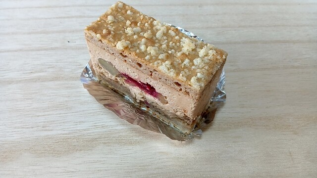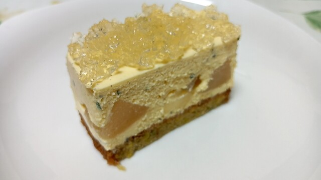 洋梨のジューシーでフルーティーな風味と香り酸味甘みのコンポートに栗のホクホクした甘みのコントラストが面白い、パイ生地の香りと風味にフルーティージューシーホクホクの食感も良く、洋梨と栗の美味しさをふんだんに感じるケーキ