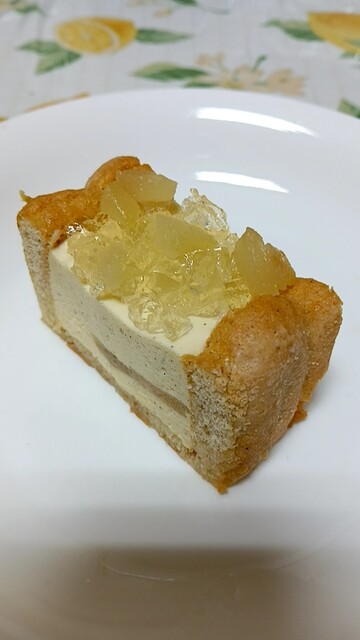 フロマージュブランとココナッツムースにパイナップル、ブリオッシュの構成、通常ブリオッシュというとババやサヴァランなど洋酒シロップにひたひた漬けるタイプですが、珍しくブリオッシュそのままをケーキに落とし込んだ作品、フロマージュブランとココナッツムースの香り風味の柔らかい食感に、ひたひた漬け込んでいないのでブリオッシュのハードな食感に小麦の香りと風味が面白い、噛み締めると小麦の風味がムースと共に変化していきヴィエノワズリーのようなケーキ、パイナップルのアクセントも◎
