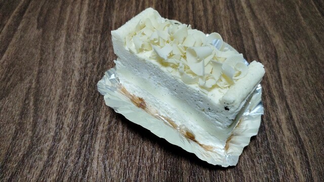 シンプルなムースショコラブランのホワイトチョコレートのケーキ、濃厚でスッキリ爽やかホワイトチョコレートの甘みと旨味にキルシュよウォッカの香りが魅惑的、パータシュー、ビスキュイジョコンドの生地旨味食感良く、シンプルなホワイトチョコレートの美味しさを感じるケーキ