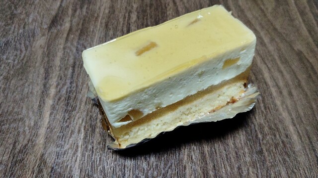 オレンジの爽やかなスッキリした酸味と香りのムースにバナナのまったりとした風味にビールがキリッと奥深くスモーキーの香る生地、パイナップルの弾ける酸味に黄桃のまろやかな甘み、フランボワーズの華やかな酸味のフルーツの弾け具合とビールとバナナのまったりと香り奥深さが気持ち良いケーキ