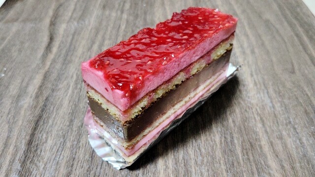 フランボワーズのコンポートのフルーティーな豊満な甘みと酸味がスッキリ、ワインのムースの香りと甘みに絶妙なマッチング、ピスタチオの香ばしい生地との対比が美しい華麗なフランボワーズが美味しいケーキ