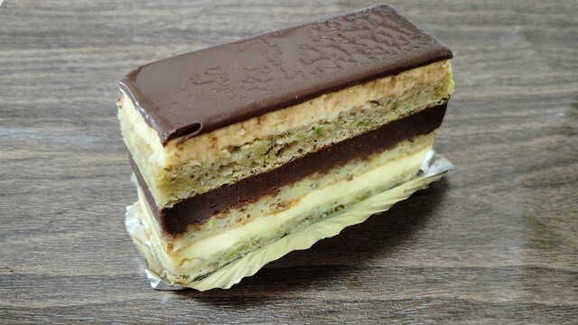 こちらもショコラとトロピカルの素晴らしい関係性、通常チョコレートとトロピカルというとチョコレートの激しい甘みの濃厚さにトロピカルの弾けるような甘みがぶつかり合い喧嘩、激しい甘みの喧嘩の違和感が出てしまいますが、チョコレートではなくカカオやココアのようにふんだんに感じる濃厚な香りで甘みをほとんど感じないショコラが最高に素晴らしい、ショコラの濃厚で香り高い風味の自然公園のような土台にパイナップルとパッションの弾けるような甘み酸味風味が花火のように弾け出す、絶景が見えるような素敵な味わい、カカオという額縁に描かれるパッションの弾ける色彩が素晴らしい、洋酒、ピスタチオも素晴らしい味わいを描き脳内に絵画が見えるようなケーキ