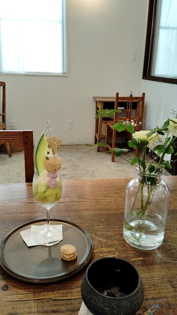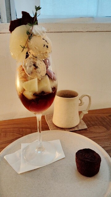 ぶどうのパフェはシャインマスカットなど甘みが強くなりがちで酸味苦味香りが弱くぶどうと甘ったるさが主張しがちですが、ラムイチジクアイスの洋酒とイチジクのバランス良い風味にシナモン、後半にはヨーグルトアイスのスッキリした酸味甘みに梨のジンジャーマリネの香り良いジンジャーに梨のサッパリした甘みと酸味の食感、赤ワインジュレの香り良い酸味にカラメルパンナコッタの苦味がアクセントが変わる変わる登場し全く飽きさせないぶどうを取り巻く、酸味苦味香り風味スパイスの七変化がとても上手