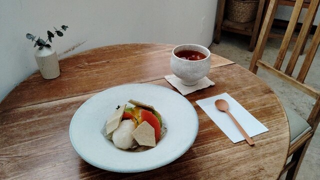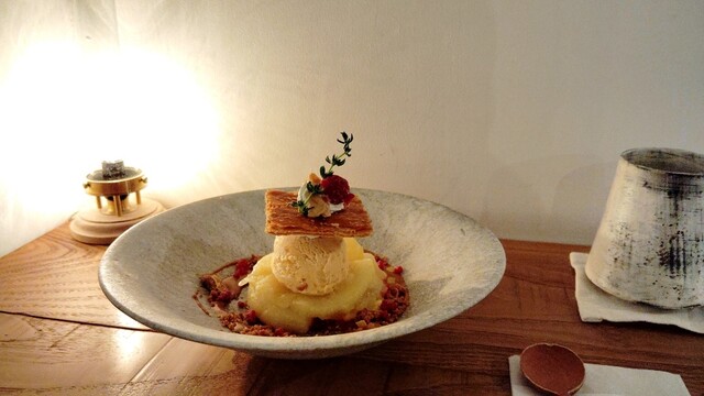 カモミールとナッツの香ばしい香りと甘み、フレッシュメロンの若々しい青い香り、煎茶メレンゲのバランス良い溶ける食感の甘み、マスカルポーネのスッキリしたクリームの甘み酸味、パイ生地がサクサク香ばしく、カシスメレンゲのキリッとした香りの食感、生姜とホワイトチョコレートのスパイシーな香りがアクセントに、メロンシャーベットの爽やかな青い香冷たさが口の中をリフレッシュ、メロンのライムマリネのハーブの香りのメロンの香り絶妙なマリアージュ、チーズペッパーのコクと香りペッパーがピリッと引き締める、煎茶のパンナコッタがまろやかな滑らか優しい香り食感、白ワインジュレが切れ味のある香りとサッパリした食感にワインの奥深い風味がスッキリと締める、香りと甘み、スパイスハーブがそれぞれ重なり合う交響曲