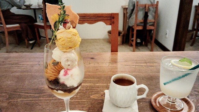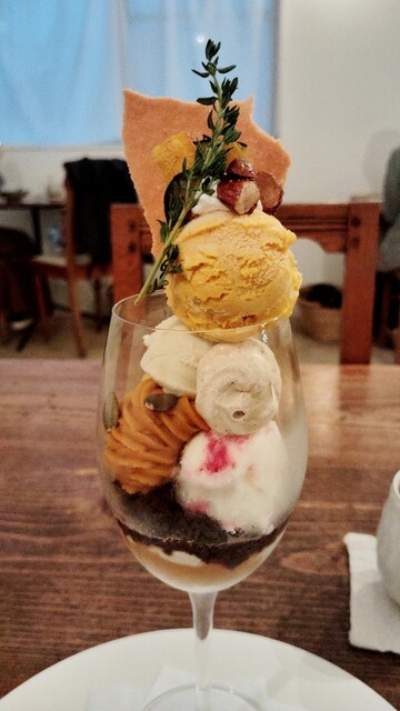 トップのラングドシャの食感と風味にかぼちゃチップの食感とかぼちゃの香り、かぼちゃのアイスとホイップの旨味にホワイトチョコレートの甘みが溶け合う、ラズベリーとヨーグルトの酸味と香りが中盤でだらけないでアクセントにスッキリ、後半にかけてココアの香りとほうじ茶の違った香りの掛け合わせがパンプキンとアイスに混ざり合う。