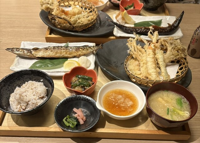 季節限定で、秋刀魚の定食があったので、天ぷらがセットになった定食を、カミさんと注文し、もちろんご飯は五穀米を選択。この日はお客さんが非常に多く、私達の前に5組ほど待ちがありましたが、秋刀魚がどうしても食べたくて待つ事15〜20分。念願の秋刀魚が登場しましたが、お客さんが多い為、五穀米が炊き上がるのに3〜5分かかるとの事で、茶碗に1/3ほどの五穀米で食べ始めました。元々大盛りでお願いしていたので、その後炊きたてをしっかり大盛りでいただき大満足でした。