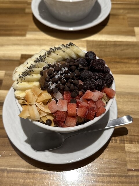 一口目は、濃厚なアサイーベースの滑らかな甘さが舌を包み、そのあとにチョコのコクが追いかけてくる。甘さが強めなんだけど、アサイーのフルーツ感と酸味がバランスを取ってくれて重さを感じさせない。ナッツやフルーツのトッピングがアクセントになってて、食感の変化も楽しい。チョコのパリッと感とか、中のアサイーとの混ざり具合がちょうどいい。