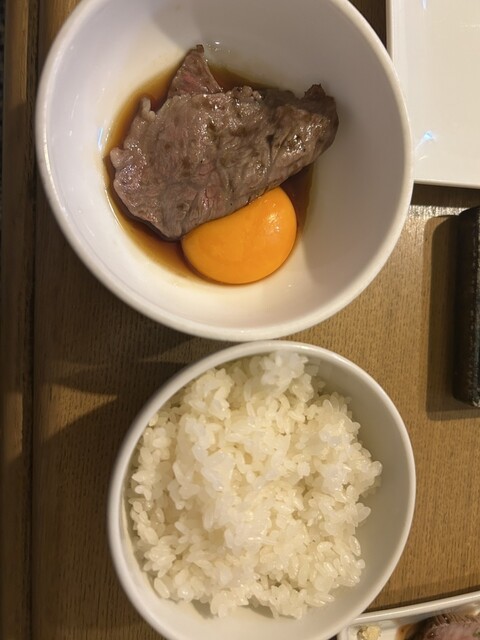 そして焼きで1品目に出てきた「リブシン」の破壊力すごい。店員さんが焼いてくれて、ちょうど良い焼き加減で、割下と卵黄で作ったオリジナルのタレを絡めてオンザライス。想像以上。