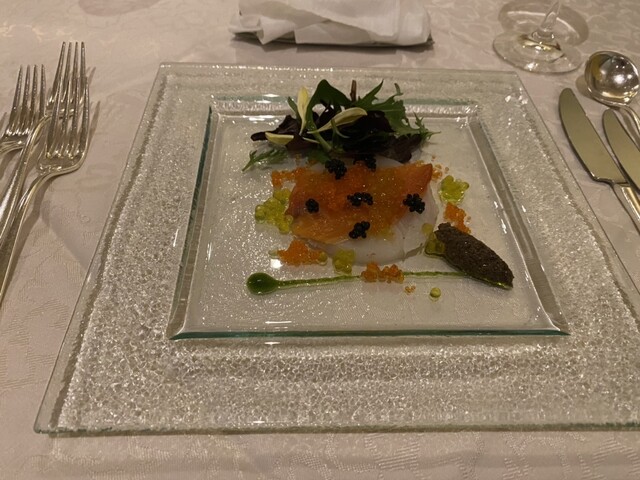 ①サーモントラウトと白身魚のマリネサラダを添えて