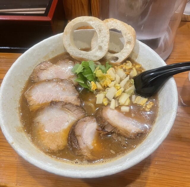 ロース焼豚1枚、レア焼豚1枚、車麩2個、海苔2枚、葱(青、白)、背脂