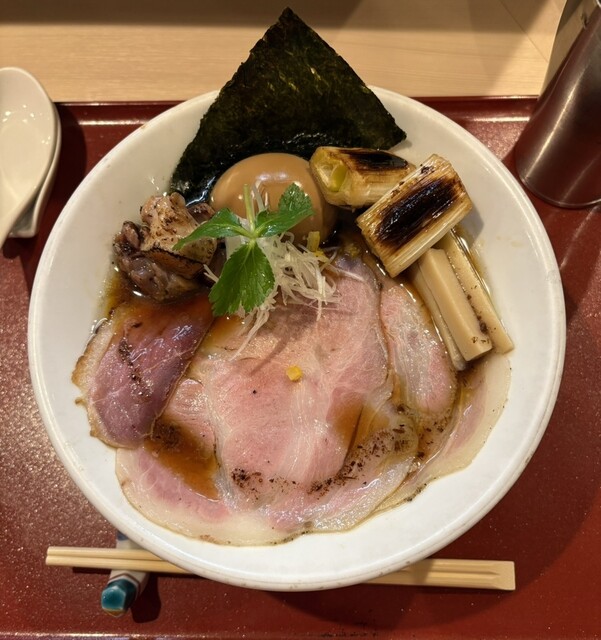 レア焼豚2枚、鴨ロース1枚、鴨もも肉3個、味玉1個、海苔1枚、焼き葱2個、タケノコ、白髪ネギ、ミツバ、柚子皮
