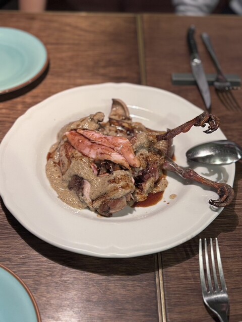 ・山うずら…真鴨と悩んだ品。クマが赤身との事であっさり目の山うずらをチョイス。淡白な味わいって話でしたが、その分クリームソースの味付けが濃厚で程よいバランス。うずらも身が引き締まってて七面鳥とかそっち寄りな感じで食べ応えあり(しかも1羽丸々でした!)見た目が結構インパクトある。