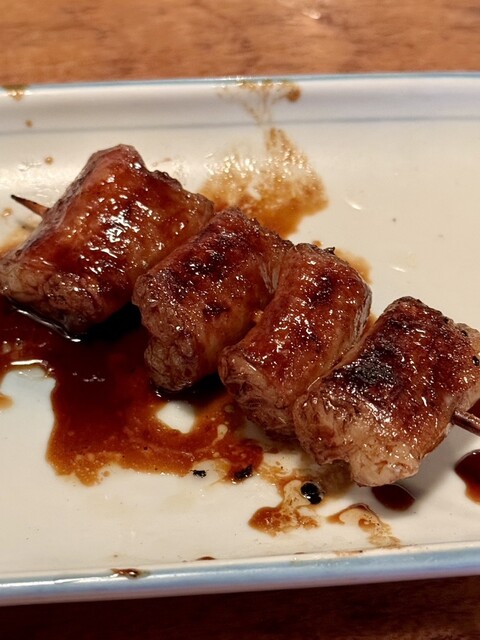 肉刺しで飲み始めて、牛ホルモンの串焼きを楽しみます。