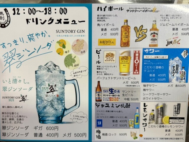 12時-18時と18時以降でドリンクの値段が変わるため、昼飲み推奨。