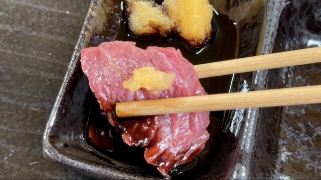 一度も凍結されていない極上の馬刺しで、純国産の馬肉は舌触り良い、しっとりとした食感で旨味が強いです。