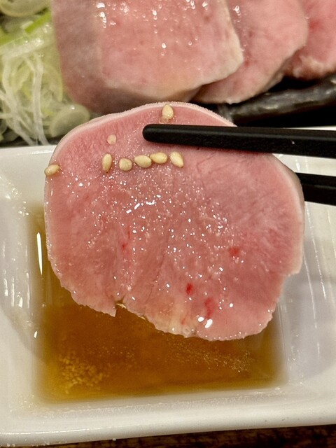 タン刺しに乗っていたスライスネギとは違い、ごま油で軽く味付けされたネギダレが美味い。