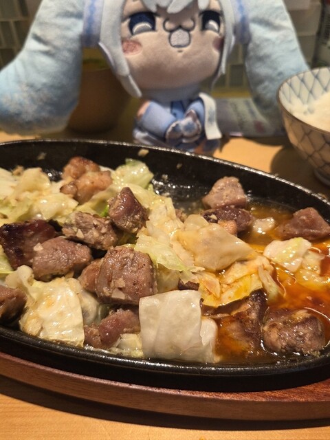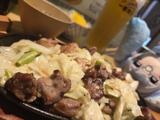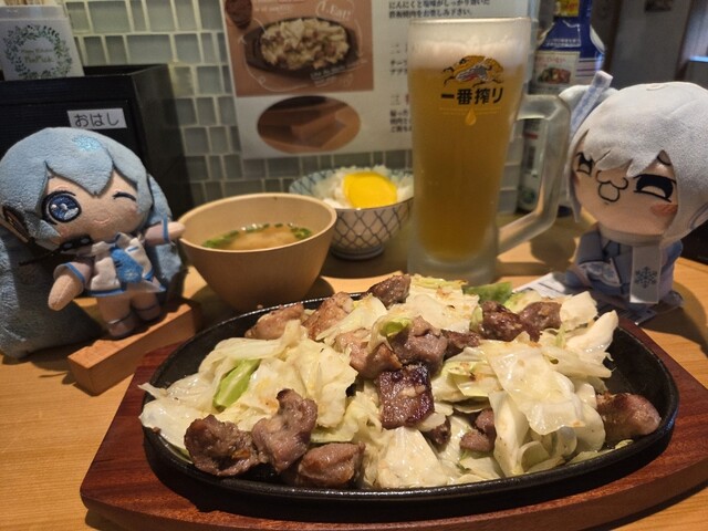 キャベツニンニクたっぷりジュージューの鉄板で噛み締める豚肉,,,| •,,) 福岡の味、府中でも楽しむの メシ、ビールが、すすみすぎる((^ω^≡^ω<ギャアアアアアアア