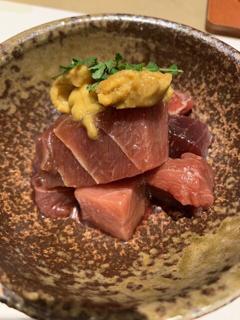 マグロ味濃くて美味しいです。雲丹も北海道産でマグロとの相性最高でした。みむろ杉奈良の日本酒とともに。