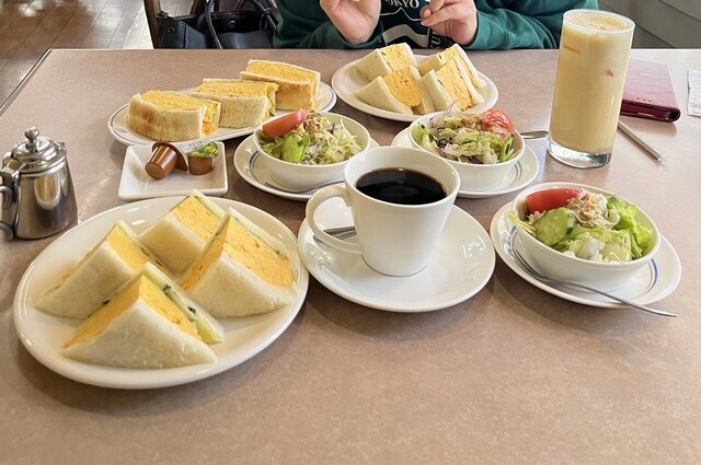 夏に引き続き冬の帰省時にもしっかり訪問しました。今回は寒いのでホットコーヒーと、でもちょっとミックスジュースも気になっていたのと、厚焼き玉子サンドに加えて厚焼き玉子トーストサンドも食べたかったので、2人で3人前のモーニングを注文してしまいました(笑)