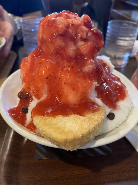 桃のかき氷を頂きました。桃はとても甘く、たくさん乗っています!ビジュアル・味ともに最高です。店内に着いたらチケットを発見してLINEで登録しておきます。順番が見れるので近づいたら店前で待機して置いて呼ばれるのを待つ仕組みです。1.2時間待つ時もありますがそれでも行きたい。それがここのかき氷です。季節ごとに色んなかき氷が食べられるので何回も足を運びたくなります。