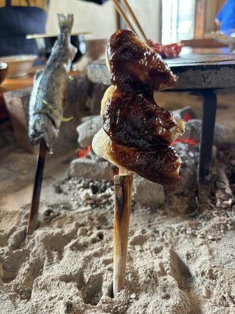山女魚の塩焼きは店員さんが囲炉裏に刺して、何度も焼き加減を見に来て調整して下さりました。