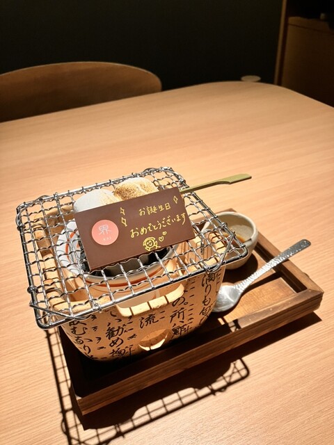 お誕生日間近でサプライズ!甘味のみたらし真珠麿(マシュマロ)にチョコプレートもつけてもるい、すごく嬉しかったです。