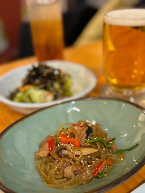 ・個人的には癖になりそうな味付け‥モッチモチ麺のチャプチェと本格キムチもとても美味しかった