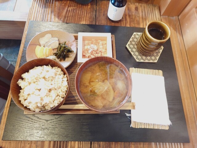 最初に白湯を出して頂き、白米・玄米・お粥から1つ選択出来ます!私は普段家で食べることのない玄米をお願いしました。
