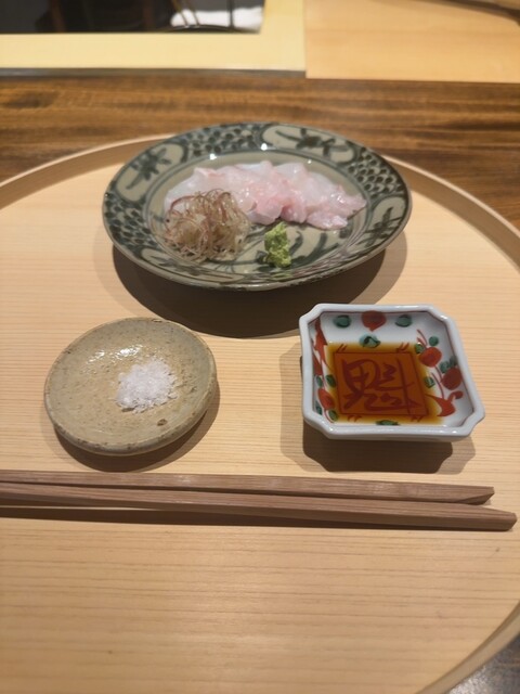 皮がパリっと炙られた金目鯛。最初は塩で。素材自体が一級品なので塩だけでも満足できる。また実山椒醤油も抜群に合う。白髪ネギも良いアクセント。