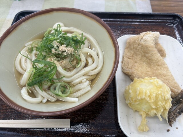 いりこかけつゆで、自家製あげ、いただきました。ワカメ、ネギ、天かす、いりこ佃煮、美味しくいただきました。自分で茹でるタイプのセルフうどん。休日の昼間は混んでますが、座って食べられるペースで回転率良しです。連れは、冷やしぶっかけ温玉乗せ、とり天でした。店員さんが気持ちよく、田舎ならではの接客でいいですね!
