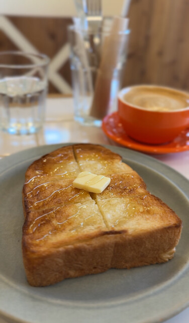 トーストはカリっともちもちの厚切りが好み。ラテは浅煎りか深煎り選べたので深煎りをチョイス。