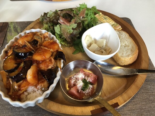 なんとなく見つけたお店 あんぷ〜の看板みて、お邪魔しました。予約なしでも大丈夫♀️お店の中は、とても落ち着きます。ランチがワンプレート 色々な丼を選べましたが、海老チリ丼を選びました。スープは、麹を使っていてはじめて食べたスープとても美味しい!とても心地よくホッとするスープでした。ワンプレートの上にはサラダや卵焼き、シナチクの漬物、海老チリ丼も!海老と茄子の相性バツグン。味付けも、とても美味しい夜はコース料理あると、でも予約で日中でも可能と書いてあったので、今度は予約してコース食べてみたい。落ち着いた感じの、フレンチ!是非また来たい!と。お店の人は、男性の人が一人で作っていて、ちょっと寡黙でしたが、その方がゆっくりできて、ちょうどいい。