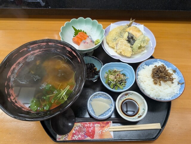 ランチで、煮麺定食1980円をいただきました。サーモンと鯵のお刺身。イワシと茄子、かぼちゃ、ピーマン、さつまいもの天ぷら。ひじきの煮物、青菜のお浸しとお漬物がついていました。煮麺は、三つ葉、とろろこぶと出汁の良いコラボで美味しかったです。評判のお店だけあって、お刺身も新鮮。小鉢、天ぷらも抜群でした。ランチメニューが豊富なので、迷います。本日はお刺身定食と思っていたのですが、食材のバランスが良く品数でもこちらを選択しました。お腹いっぱいになりましたが、身体に優しい感じでした。また機会があれば伺いたいと思います。店内、広くはないですがアットホームな雰囲気で、お店の方もとても気さくな感じで居心地が良かったです。駐車場はお店の前にあり、譲り合えば4台ぐらいとめられるようです。近くには三輪素麺のお店が複数あるのですが、三彩さんは大発見でした。